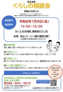 高知県社会福祉協議会では、嶺北地区にて『暮らしの相談会』を開催します。お金や仕事に関すること、心と体の健康のこと、その他、借金・離婚・日常生活のトラブル等について、本会職員や弁護士がお話をうかがいます。お気軽にご相談ください。秘密厳守・相談無料